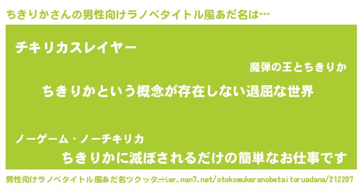 | 女子向けラノベタイトル風あだ名 | 『異世界で失敗しない100のちきりか』 |