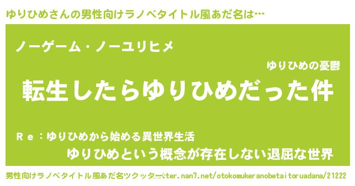 | 女子向けラノベタイトル風あだ名 | 『ゆりひめの玉の輿計画!』 |