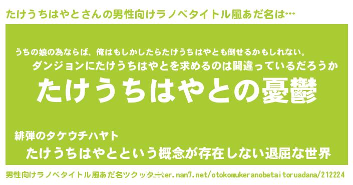 | 女子向けラノベタイトル風あだ名 | 『(仮)たけうちはやとのやんごとなき事情』 |