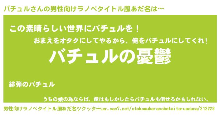 | 女子向けラノベタイトル風あだ名 | 『(仮)バチュルのやんごとなき事情』 |