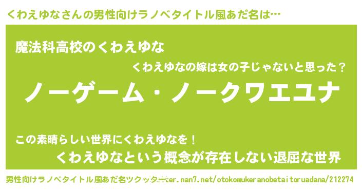| 女子向けラノベタイトル風あだ名 | 『死神くわえゆなの再婚』 |