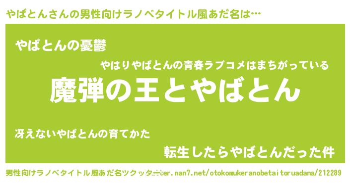 | 女子向けラノベタイトル風あだ名 | 『やばとんが死なない童話 林檎のやばとんの診療簿』 |