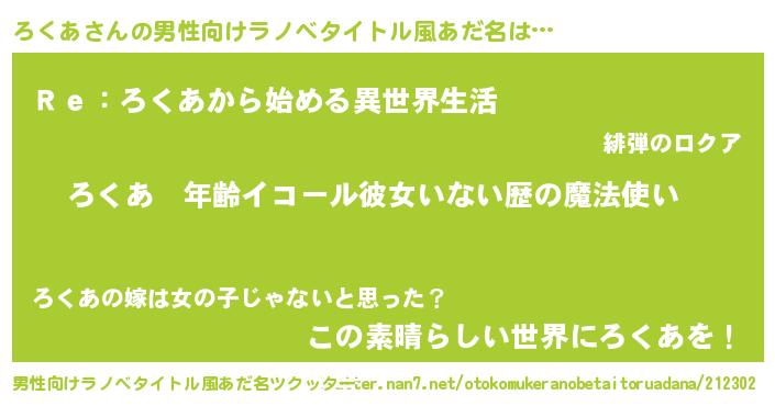 | 女子向けラノベタイトル風あだ名 | 『ろくあの玉の輿計画!』『闇のろくあ』 |