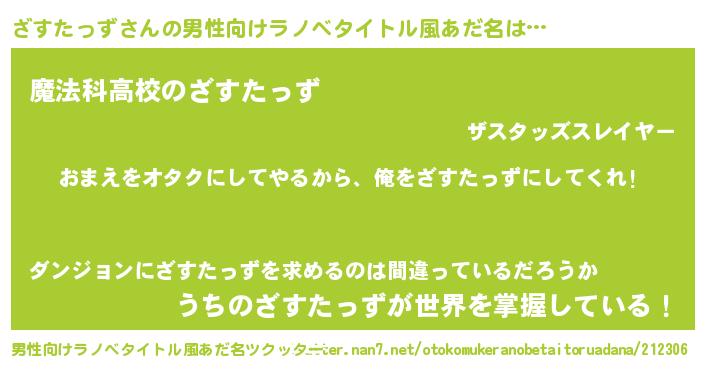 | 女子向けラノベタイトル風あだ名 | 『ざすたっず夫妻のなれそめ』 |