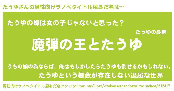 | 女子向けラノベタイトル風あだ名 | 『たうゆが死なない童話 林檎のたうゆの診療簿』 |