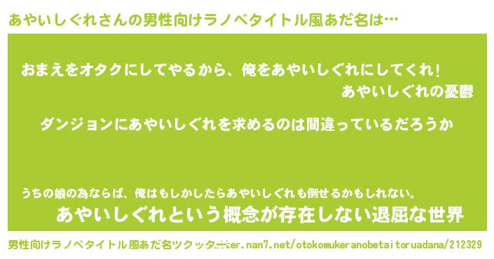 | 女子向けラノベタイトル風あだ名 | 『あやいしぐれの卵を拾いまして』 |