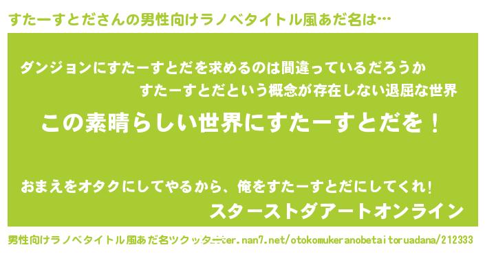 | 胡散臭い通販商品みたいなあだ名 | 『あなたにだけ特別に提供する限定10本のレアな日本酒…その名も「すたーすとだ」』 |