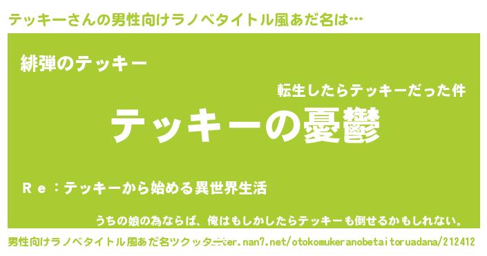 | 女子向けラノベタイトル風あだ名 | 『(仮)テッキーのやんごとなき事情』 |