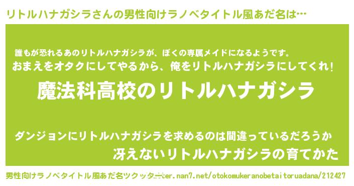 | 女子向けラノベタイトル風あだ名 | 『リトルハナガシラなんてお断りですっ。』 |