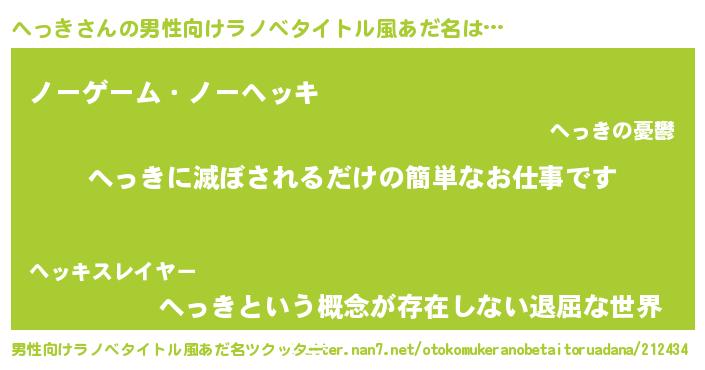 | 女子向けラノベタイトル風あだ名 | 『横柄へっきと宰相陛下』『へっき恋絵巻』 |