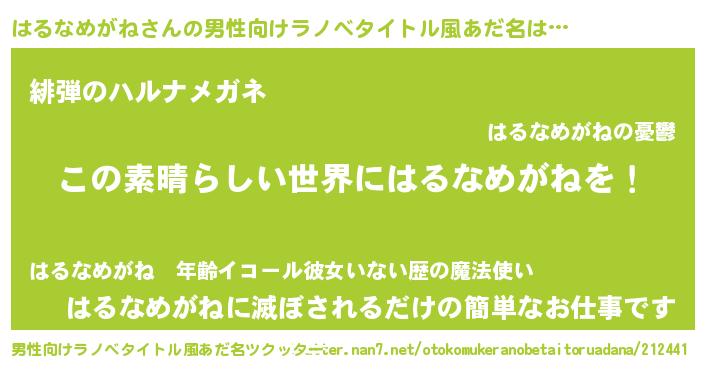 | 胡散臭い通販商品みたいなあだ名 | 『世界中を虜にした世界で10本だけ現存している希少なブランデー…その名も「はるなめがね」』 |