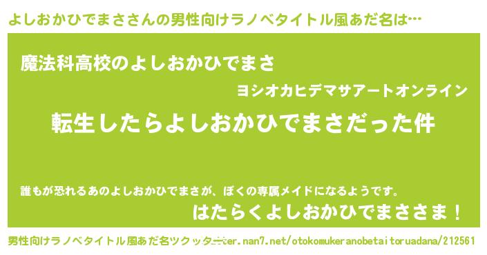 | 女子向けラノベタイトル風あだ名 | 『よしおかひでまさの玉の輿計画!』 |