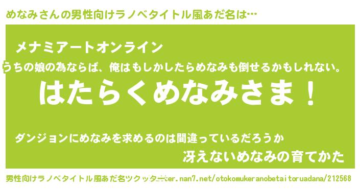 | 胡散臭い通販商品みたいなあだ名 | 『必ず成功するブレスレット…その名も「めなみ」』 |