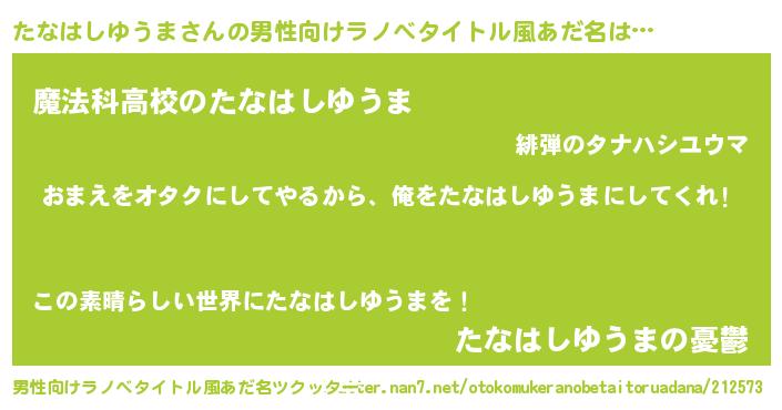 | 女子向けラノベタイトル風あだ名 | 『たなはしゆうま夫妻のなれそめ』 |