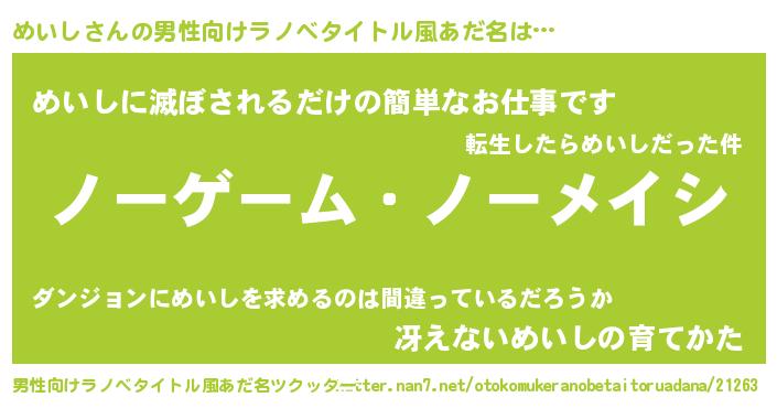 | 女子向けラノベタイトル風あだ名 | 『死神めいしの再婚』 |