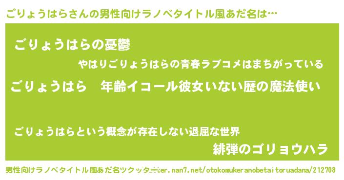 | 女子向けラノベタイトル風あだ名 | 『ごりょうはらの玉の輿計画!』 |