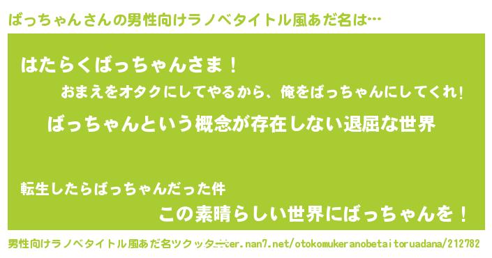 | 女子向けラノベタイトル風あだ名 | 『異世界で失敗しない100のばっちゃん』 |