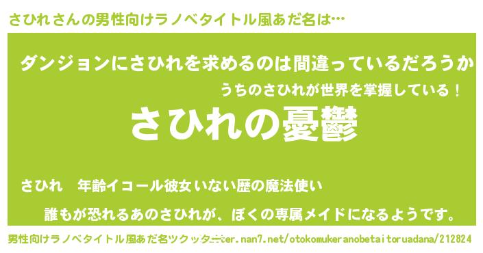 | 女子向けラノベタイトル風あだ名 | 『(仮)さひれのやんごとなき事情』 |