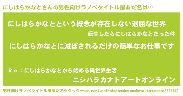 | ヒーロー風カッコイイあだ名 | 『ネオニシハラカナト』『幻影騎士ニシ』 |