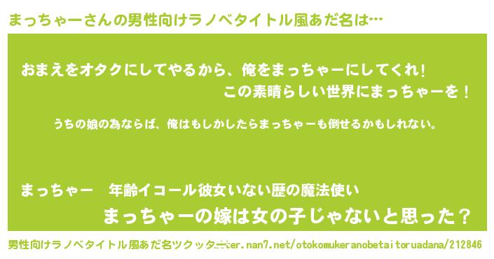 | 胡散臭い通販商品みたいなあだ名 | 『世界が平和になる高級そうな壺…その名も「まっちゃー」』 |