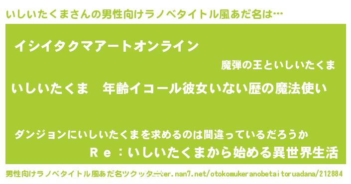 | 女子向けラノベタイトル風あだ名 | 『いしいたくまの玉の輿計画!』 |