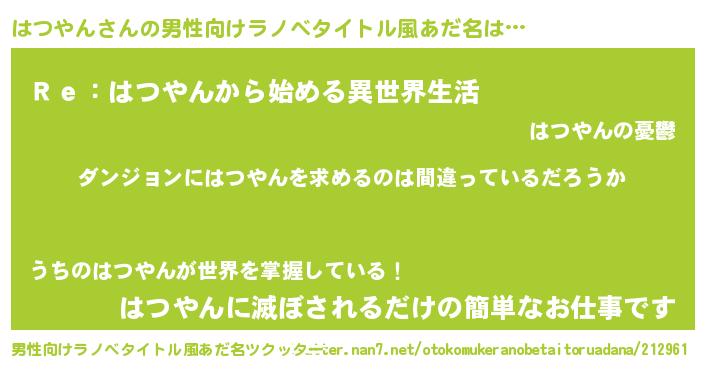 | 女子向けラノベタイトル風あだ名 | 『はつやんの卵を拾いまして』 |