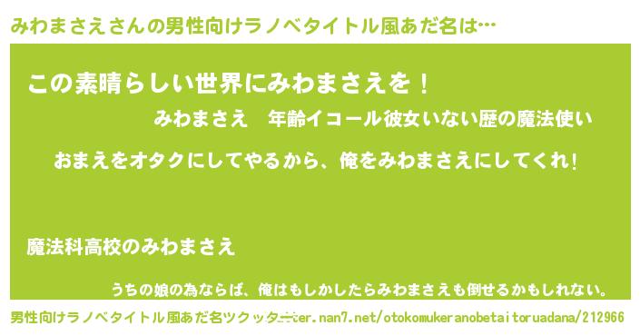 | 女子向けラノベタイトル風あだ名 | 『みわまさえ夫妻のなれそめ』 |