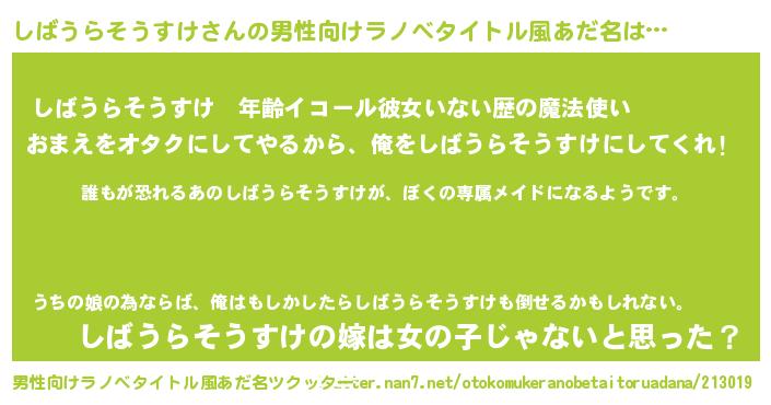 | 女子向けラノベタイトル風あだ名 | 『異世界でカフェしばうらそうすけを開店しました。』 |