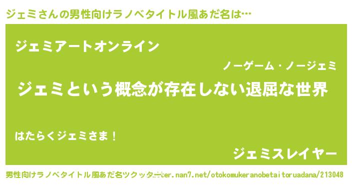| 女子向けラノベタイトル風あだ名 | 『異世界で失敗しない100のジェミ』 |