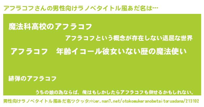 | 女子向けラノベタイトル風あだ名 | 『アフラコフの玉の輿計画!』 |