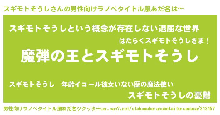 | 女子向けラノベタイトル風あだ名 | 『スギモトそうしが死なない童話 林檎のスギモトそうしの診療簿』 |