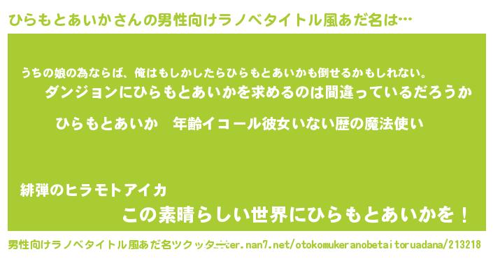 | 女子向けラノベタイトル風あだ名 | 『ひらもとあいかの玉の輿計画!』 |
