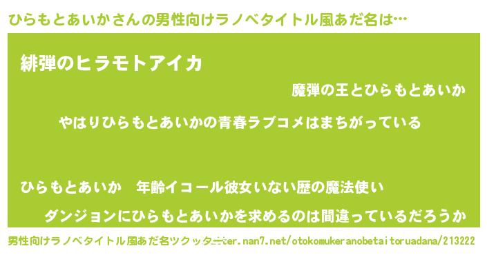 | 女子向けラノベタイトル風あだ名 | 『ひらもとあいか伯爵の花嫁』 |