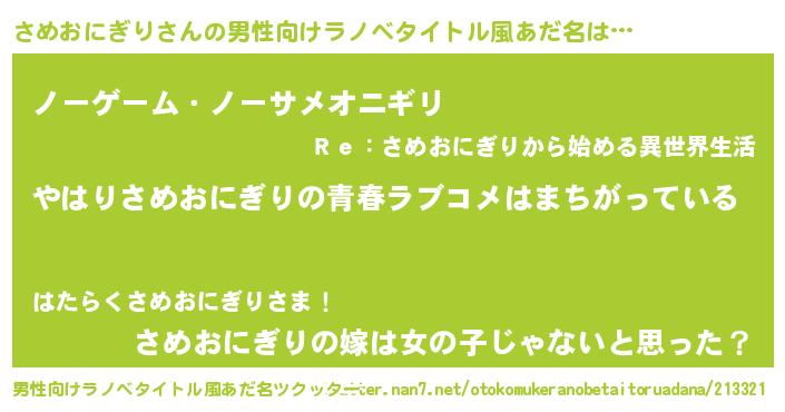 | 女子向けラノベタイトル風あだ名 | 『さめおにぎり伯爵の花嫁』 |