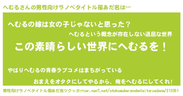 | 女子向けラノベタイトル風あだ名 | 『乙女ゲームの破滅フラグしかない悪役へむるに転生してしまった…』 |