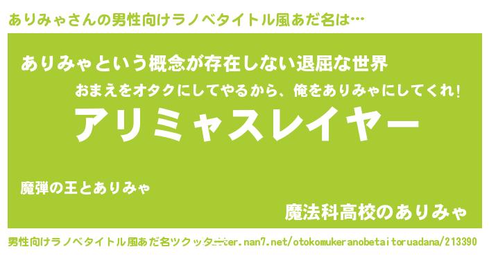| 胡散臭い通販商品みたいなあだ名 | 『絶対に幸福をもたらす水素水…その名も「ありみゃ」』 |