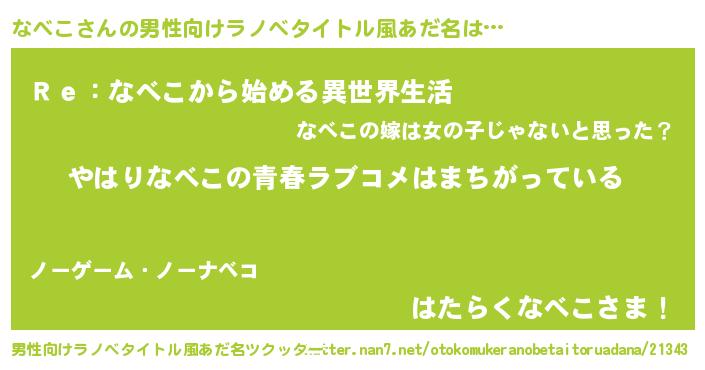 | 女子向けラノベタイトル風あだ名 | 『なべこ伯爵の花嫁』『死神なべこの再婚』 |