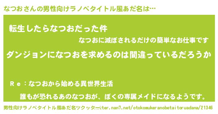 | 女子向けラノベタイトル風あだ名 | 『なつおの卵を拾いまして』『闇のなつお』 |