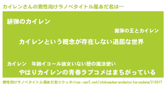 | 女子向けラノベタイトル風あだ名 | 『異世界で失敗しない100のカイレン』 |