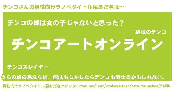 | 女子向けラノベタイトル風あだ名 | 『チンコ姫と円卓の騎士』 |