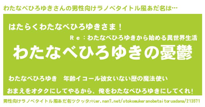 | 女子向けラノベタイトル風あだ名 | 『わたなべひろゆき姫と円卓の騎士』 |