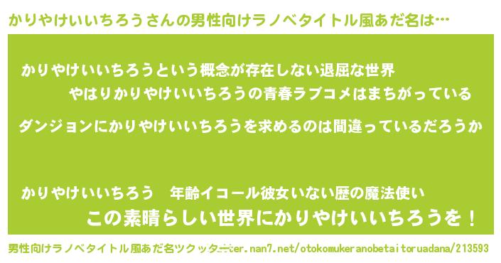 | 女子向けラノベタイトル風あだ名 | 『かりやけいいちろうの卵を拾いまして』 |