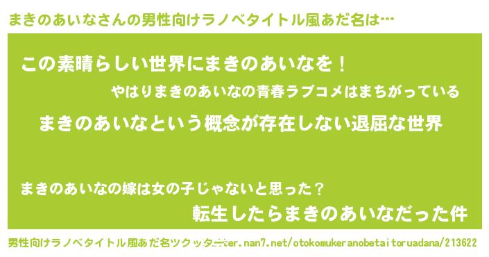 | 女子向けラノベタイトル風あだ名 | 『異世界で失敗しない100のまきのあいな』 |