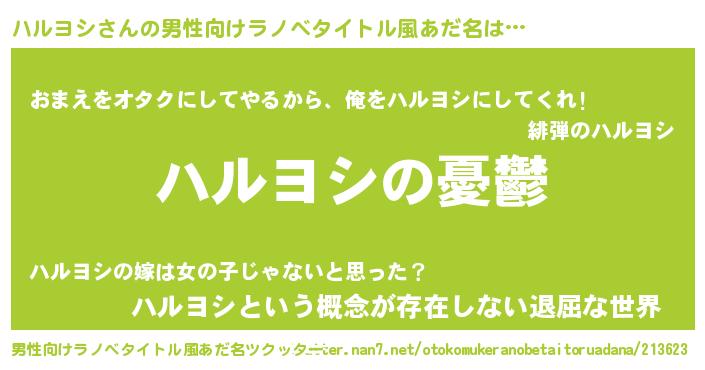 | 女子向けラノベタイトル風あだ名 | 『(仮)ハルヨシのやんごとなき事情』 |