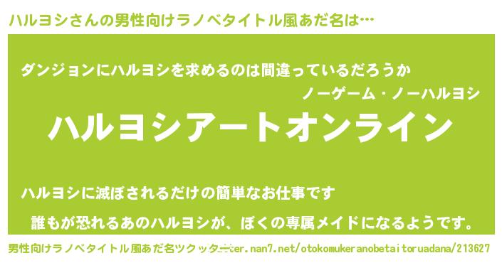 | 女子向けラノベタイトル風あだ名 | 『ハルヨシ姫と円卓の騎士』 |