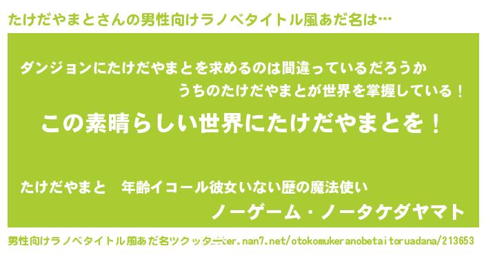 | 女子向けラノベタイトル風あだ名 | 『悪役たけだやまとに転生したようですが、知った事ではありません』 |