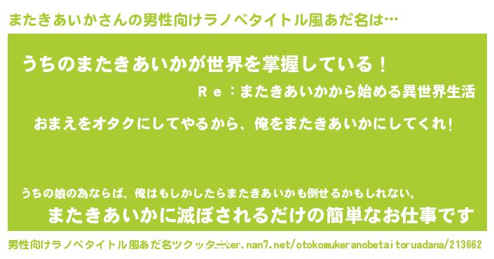 | 女子向けラノベタイトル風あだ名 | 『またきあいか夫妻のなれそめ』 |