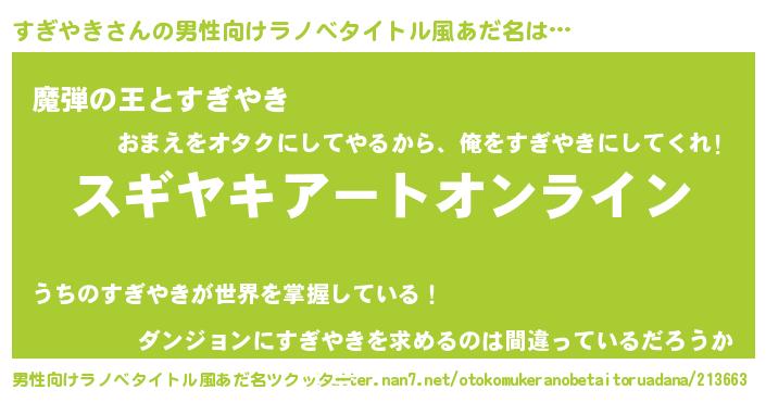 | 女子向けラノベタイトル風あだ名 | 『誰かこのすぎやきを説明してください! ~契約から始まるウェディング~』 |