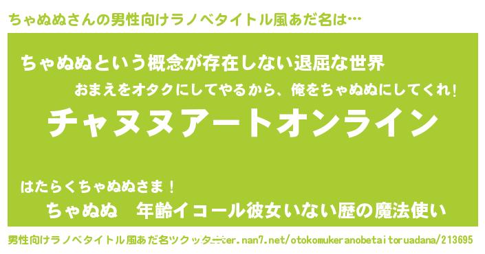 | 胡散臭い通販商品みたいなあだ名 | 『億万長者になれる霊験あらたかなお札…その名も「ちゃぬぬ」』 |