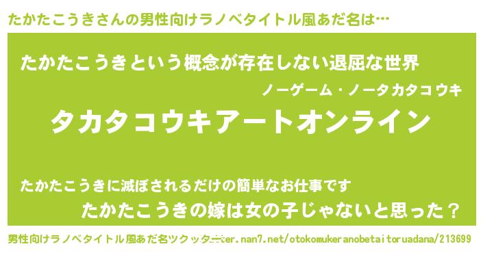 | 女子向けラノベタイトル風あだ名 | 『誰かこのたかたこうきを説明してください! ~契約から始まるウェディング~』 |